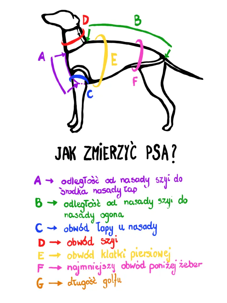 Zmierz długości (A, B) i obwody (C-F) za pomocą miękkiej miarki krawieckiej według poniższej grafiki. Postaraj się zrobić to dokładnie, tak abyśmy mogli jak najlepiej dopasować ubranko do Twojego pupila.
